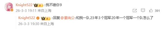Knight回复网友:和我一队23年3个冠军,20年一个冠军一个队,怎么了?